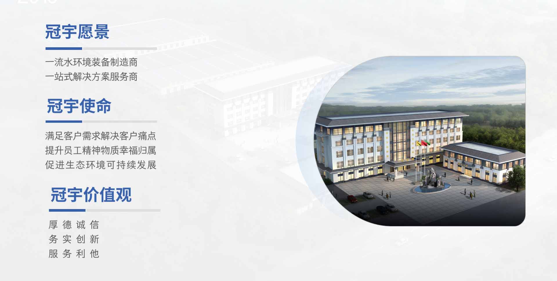 河北冠宇環(huán)保設(shè)備股份有限公司是一家專注于水處理技術(shù)與環(huán)保裝備研發(fā)的高科技企業(yè),集生產(chǎn)制造、技術(shù)研發(fā)、工程設(shè)計(jì)施工、進(jìn)出口貿(mào)易于一體的國(guó)家高新技術(shù)企業(yè)、科技型企業(yè)、科技小巨人企業(yè)、創(chuàng)新型企業(yè)、專精特新企業(yè)、規(guī)上企業(yè)、掛牌上市企業(yè),股權(quán)代碼:660171。公司成立于2006年,總部位于河北省石家莊市,是石家莊市環(huán)境服務(wù)業(yè)商會(huì)會(huì)長(zhǎng)單位和河北省環(huán)境保護(hù)產(chǎn)業(yè)協(xié)會(huì)副會(huì)長(zhǎng)單位。公司以“創(chuàng)新驅(qū)動(dòng)、綠色環(huán)保”為核心理念,致力于城市供水與醫(yī)藥化工行業(yè)的生產(chǎn)用水處理、市政、印染等行業(yè)的污廢水治理。公司憑借自主研發(fā)的高級(jí)氧化設(shè)備,致力于并打造一流水環(huán)境裝備制造商及一站式解決方案服務(wù)商。